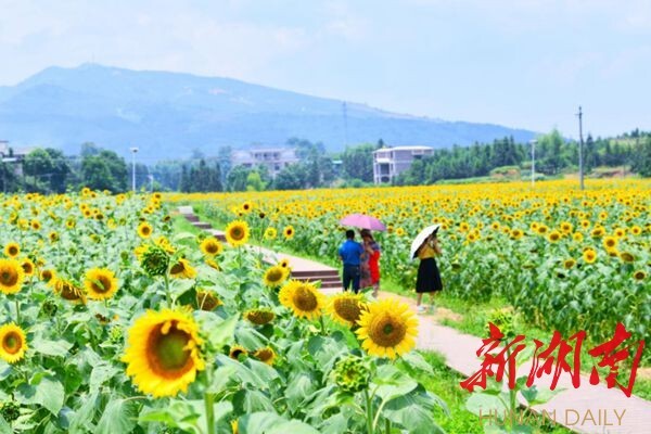 7月12日,记者驱车来到常宁市胜桥镇留田村向日葵基地,只见数百亩向日葵汇成一片金色花海,随风摇曳。游客穿行在葵花丛中,不时传出阵阵欢声…… △向日葵花开美如画 “葵花是个好产业,观赏性强,经济效益也很可观。”胜桥镇留田村村支书秦运龙告诉记者,葵花又称向日葵,其花期可从6月底持续到7月中旬,期间每周可吸引省内外数万名游客前来观赏。同时,1亩葵花还能产籽榨油约200公斤,每公斤葵花油可以卖到30元左右。 “今年,向日葵基地流转了我家3亩土地,还为我安排了工作,现在我不光能挣到土地流转费、除草费、葵花籽收割费,还能获得基地定期分红,今年预计可增收上万元。”留田村贫困户李金桂的父亲因患癌症躺在床上,其母亲身体也欠佳需人照顾,李金桂只能在家种田补贴家用,入不敷出,说起向日葵产业带来的改变,李金桂喜上眉梢。 常宁市部分乡镇地势平坦、土壤疏松肥沃、排灌配套设施齐全,适合向日葵种植。近年来,该市依托这些优势,引导贫困户和农业经营主体大力发展向日葵产业,采取“合作社+贫困户”模式,帮助贫困户以土地和现金的方式入股,股民每年可获得投资额10%左右的利润收入。今年该市共种植葵花5000余亩,直接带动3000余村民增收。 常宁市扶贫办相关负责人介绍,该市在种植葵花同时,还打造了万亩樱花园、千亩荷花基地等周边旅游休闲产业,这些项目均通过土地流转、公司大规模种植等方式,帮助村民获得土地流转租金和分红,并解决就业实现增收。