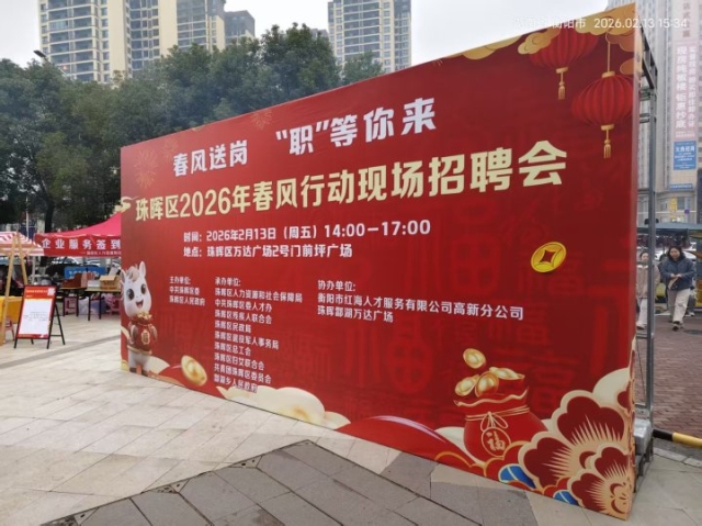 2月13日下午,酃湖万达广场2号门前坪人头攒动、气氛热烈,由中共珠晖区委、区人民政府主办的“春风送岗‘职’等你来”2026年春风行动现场招聘会在此成功举办。活动以“线下面对面+线上云互动+智能新体验”的创新模式,为用人单位和求职者搭建起高效便捷的对接桥梁。