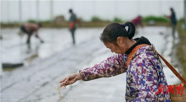 春耕时节,春雨淅沥。衡东县三樟镇澎陂港村集中育秧田里,农户们身披雨衣、脚穿雨靴,在泥泞的田块中忙碌。平整秧田、摆放育秧盘、覆盖保温膜,将一粒粒稻种播撒在湿润的泥土中。