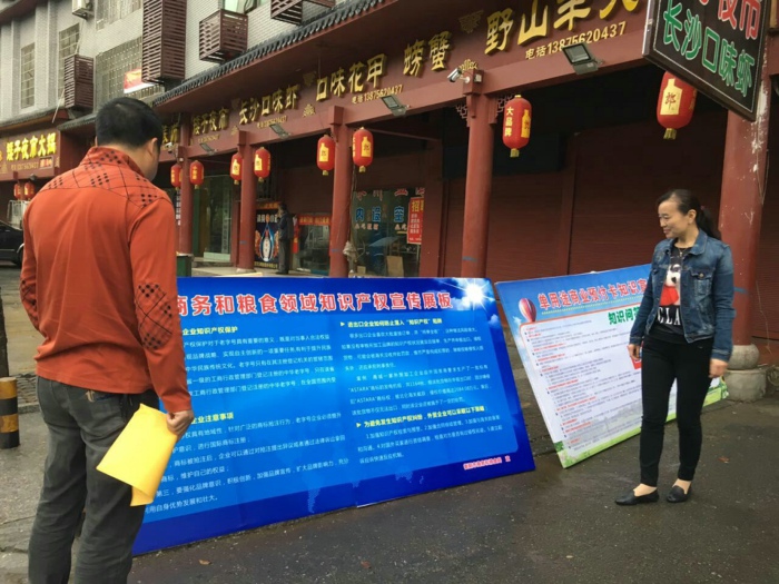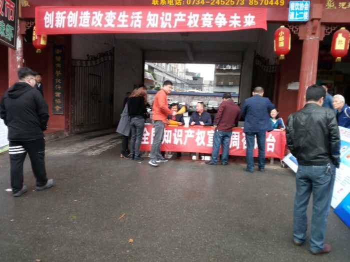 为迎接“4.26”第17个世界知识产权日,4月21日上午,市商务和粮食综合执法支队会同市场秩序科在石鼓区湘江北路开展2017年“全国知识产权宣传周”活动。市商务和粮食局副局长、纪工委书记史子发到活动现场指导并参与咨询服务。
