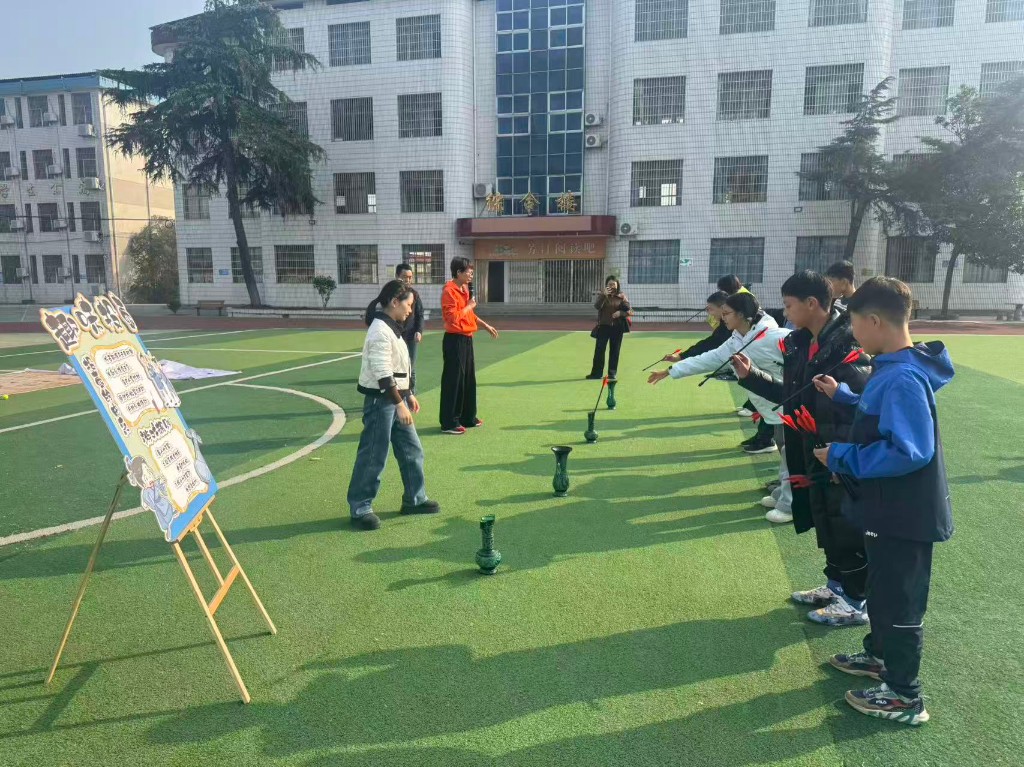 为增强活动的体验性与教育性,现场精心设置了融合历史内涵与趣味性的互动环节。在“投壶明志”体验区,这项古老的礼仪活动被赋予了“坚定目标、心无旁骛”的新时代寓意。学生们在尝试与竞技中,不仅体验了中华传统技艺的雅趣,更在潜移默化中感悟到革命者为实现理想专注不移、百折不挠的品格。“重走长征路”互动游戏则成为全场焦点。同学们以团队形式,模拟穿越“雪山草地”、“突破封锁线”,过程中穿插长征知识问答与团队协作挑战。欢声笑语中,红军长征的艰苦卓绝与非凡智慧变得可知可感,深刻诠释了信念与团结的力量,让伟大长征精神在新时代青少年心中生根发芽。为鼓励学生的积极参与和出色表现,为现场踊跃参加各项互动环节的学生奖励了精美的文具用品。这一举措不仅活跃了现场气氛,更以务实的方式表达了对同学们学习热情与探索精神的肯定,将红色教育的深刻内涵与对青少年成长的真切关怀相结合。
