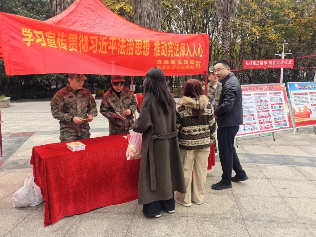 在第十二个国家宪法日来临之际,为深入学习宣传贯彻习近平法治思想,推动宪法精神与国防动员法治知识深度融合,12月4日上午,珠晖区国防动员办公室与相关单位,在区法制广场隆重开展国家宪法宣传日主题活动,为辖区机关单位、企业代表及社区居民送上了一场干货满满的“国防宣传盛宴”。
