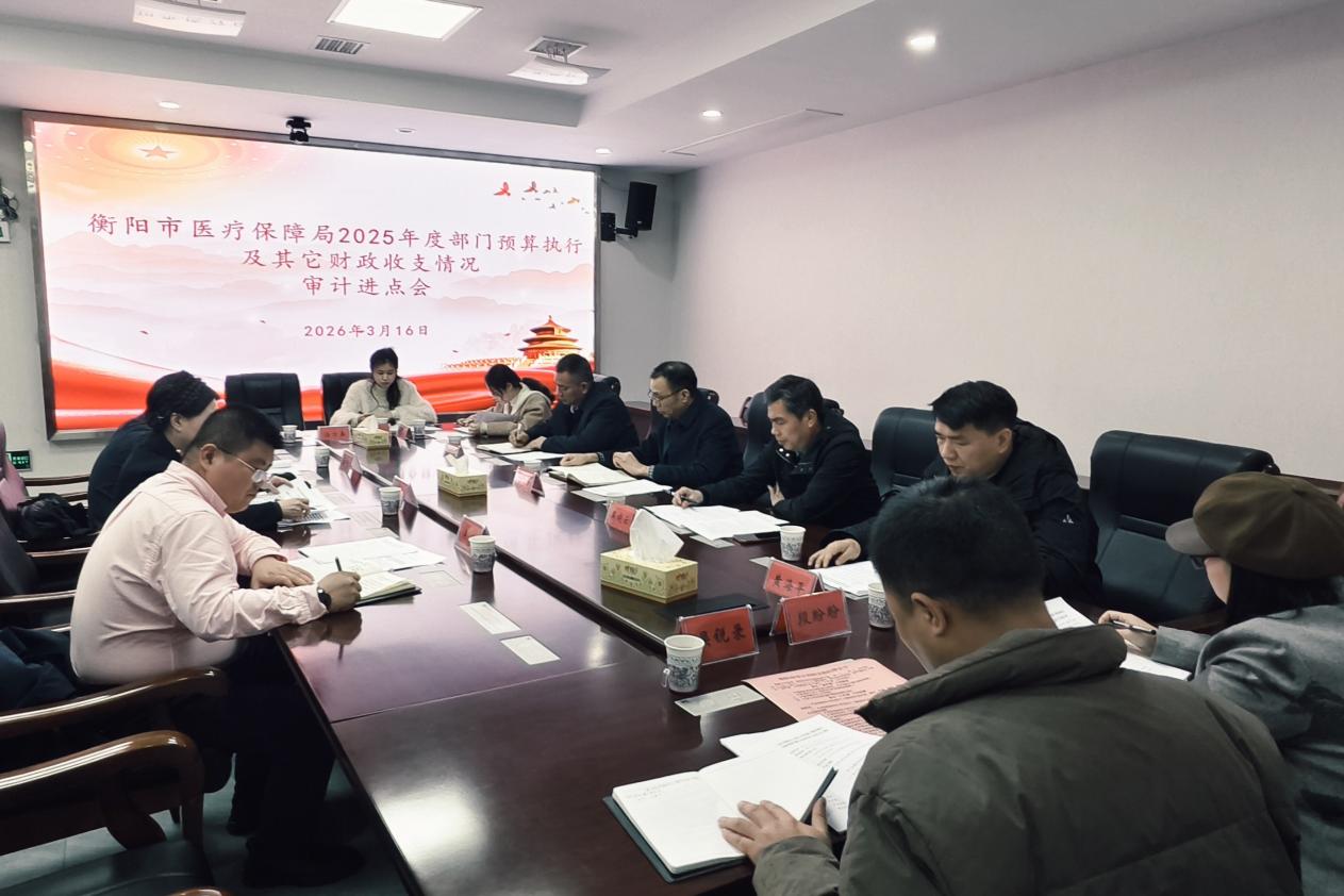 近日,衡阳市审计局召开市医疗保障局2025年度部门预算执行及其他财政财务收支情况审计进点会。市审计局党组成员、副局长、审计组组长肖湘东及审计组全体成员,市医保局局长娄涛,局党组成员、副局长罗斌、吴鹏及其所属二级机构中层以上干部参加会议。