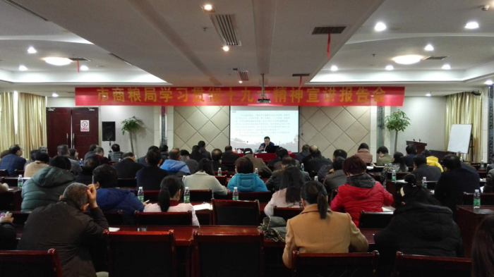 12月1日上午,衡阳市商务和粮食局召开学习贯彻党的十九大精神宣讲报告会,会议由局党委书记、局长黄建军主持,市商务和粮食局机关全体干部职工,直属单位领导班子成员,部分离退休老同志共120人参加了学习。市委党的十九大宣讲团成员、市直工委书记谢柯同志作了“学习贯彻习近平新时代中国特色社会主义思想”的专题报告。