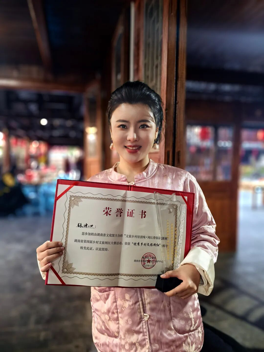 12月14日,从怀化市荆坪古村传来喜讯,在2025年“乡村网红走基层”总结交流活动暨“文旅乡村好韵味・网红带你逛潇湘”湖南省第四届乡村文旅网红大赛中,由衡阳市文化馆选拔推荐的网红达人张译心凭借扎实的专业素养与鲜明的创作特色,成功斩获“优秀乡村文旅网红”称号,为衡阳赢得省级文旅宣传荣誉。