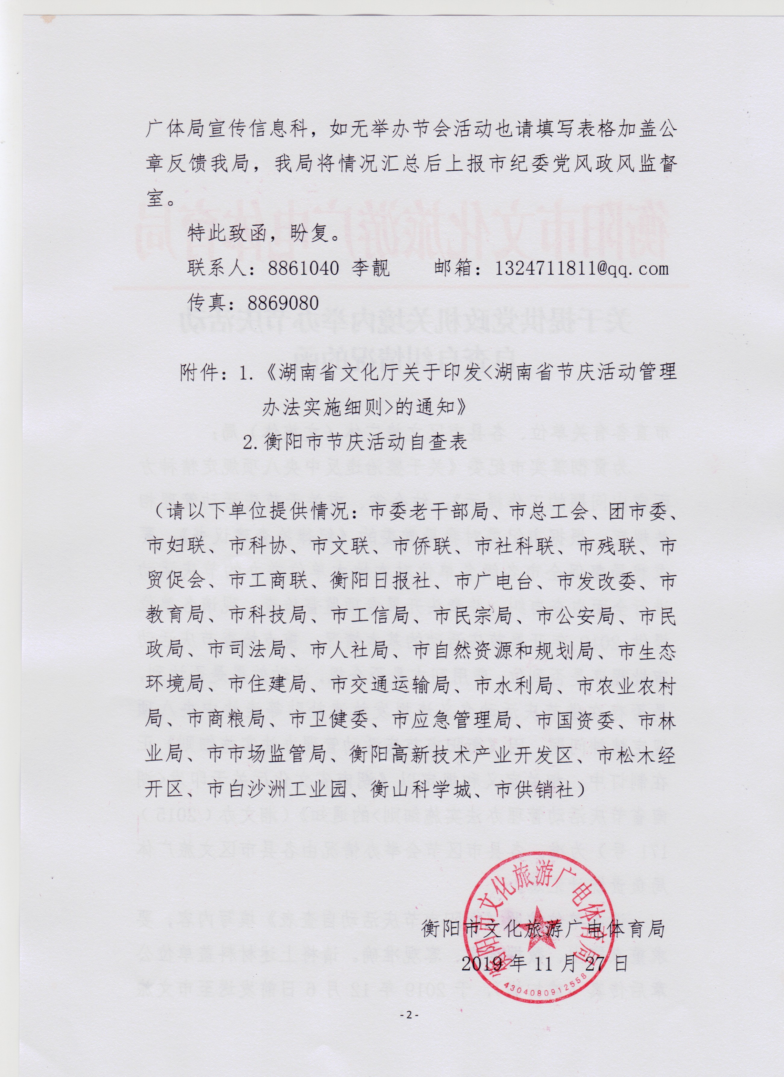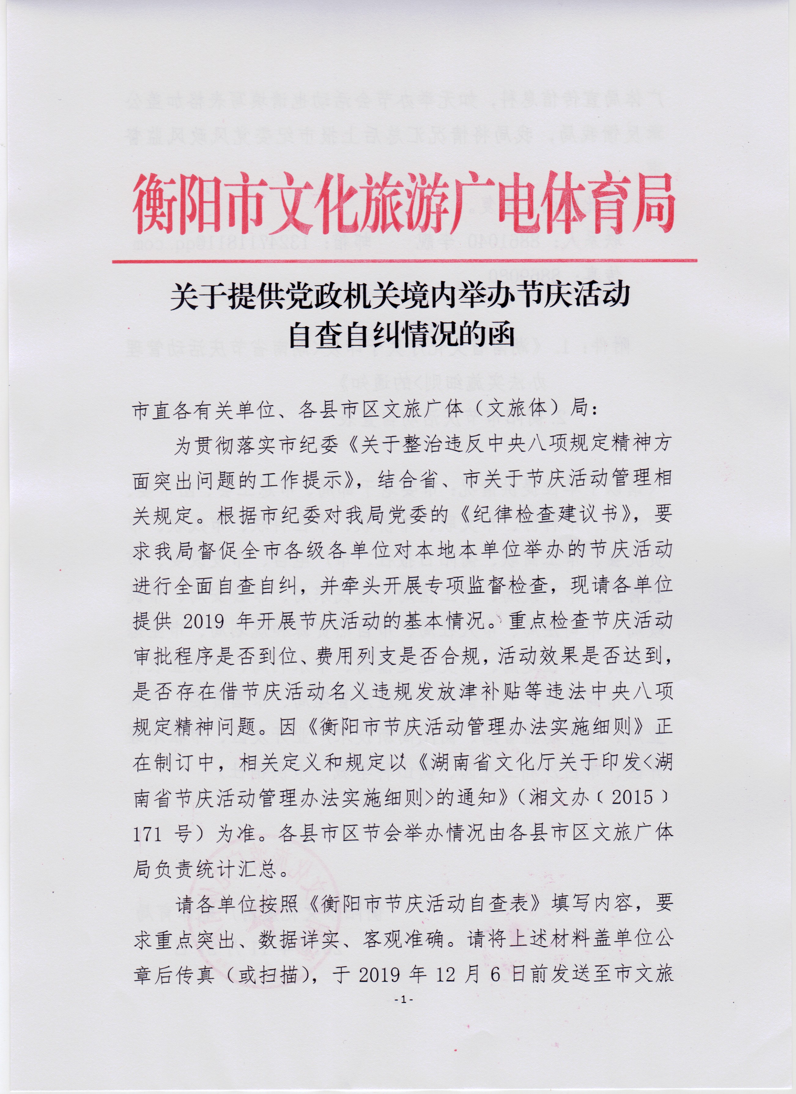 欢迎社会各界对全市党政机关主办的节庆活动予以监督,并对违反中央八项规定精神的情况提供线索,联系方式:衡阳市文旅广体局宣传信息科 电话 8861040 邮箱:1324711811@qq.com