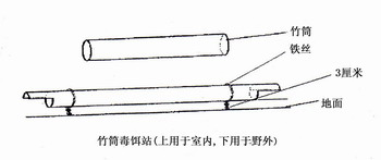 附:毒饵站灭鼠技术:将内径7-12cm的毛竹或塑料管裁节,每节长50-60cm;将每节毛竹管内的节捅开成相通形状,以便老鼠通行;在每节毛竹或塑料管两端各5cm处锯掉2/3,留1/3做成遮雨盖;在每节毛节或塑料管两端用铁丝拧成两个脚,长度8-10cm左右,以插入土中起固定作用。农户毒饵站制作时选30-40cm的管子,应用时直接放置,并用砖块、石块、土块简单固定即可。农田每亩使用毒饵站1-2个,室内每户2个,每个毒饵站放置毒饵20-30克,放置3天后根据害鼠取食情况补充毒饵。毒饵站可长期放置,重复使用。