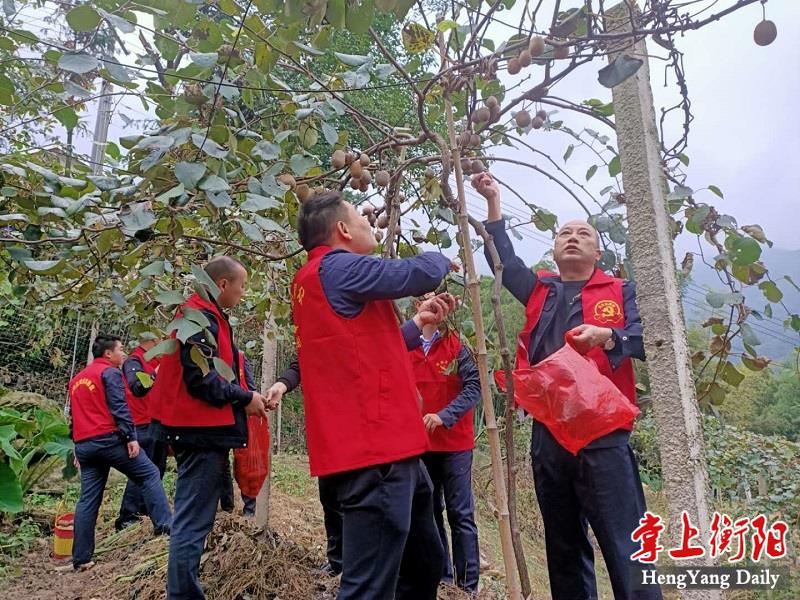 ▲南岳区区委常委、纪委书记、监委主任廖勇正在和志愿者一起采摘猕猴桃