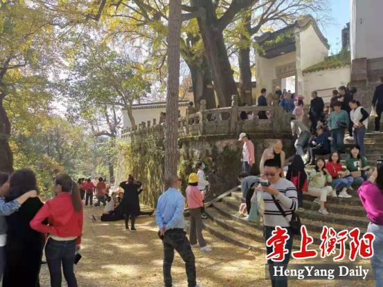 11月15日,南岳衡山福严寺景区游人如织,许多客人被这满树满地的“黄”深深吸引,纷纷拿起相机、手机拍不停,定格这瞬息变幻的美景。