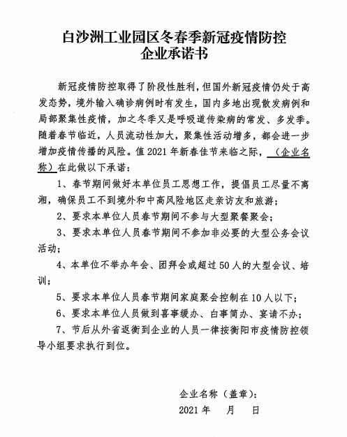 会议明确,全面掌握员工春节去向。在前期了解的基础上,进一步核实,全面掌握返乡、离开员工出行去向、行程安排、联系方式、健康状况等基本信息,建立一人一档,做到底数清、情况明;引导外省员工尽量留在工作地过节,非必要不离开。 倡导简约健康生活方式。通过视频会议,精减人员、加大座位间距的座谈会议等替代企业年会、团拜会等大型聚集性活动。提倡微信、电话、视频拜年的新风尚,减少流动与聚集,聚餐尽量在10人以内,不办酒席,不举办、不参与大型聚集性活动。留在工作地过节员工,要尽量谢绝亲戚朋友的探访探望,减少接触,降低风险。科学制定稳岗激励方案。落细落实疫情防控措施,做细做实春节生产生活、休息娱乐、环境布置、思想稳定、人文关怀工作,特别是除夕夜要提供年夜饭和娱乐活动,让留在工作地过春节的员工既能够拿到更多的薪水保障、得到更好的生活待遇,又能切实得到安全保障、获得激励尊崇。 切实做好个人防疫措施。讲卫生、勤洗手、戴口罩、测体温、用公筷,保持一米的社交距离。倡导确需返乡的员工,本地员工的返乡亲属落实自我居家健康观察14天并做好核酸检测,尽量不要前往人群密集场所、不要参加聚集性活动,一旦出现发热、咳嗽、腹泻、乏力等症状,要及时佩戴口罩就近前往发热门诊就诊,主动告知医生旅行史、接触史等情况,便于及时排查,就医过程尽量避免乘坐公共交通工具。 推行疫情防控承诺机制。园区与企业、企业与员工分别签订疫情防控承诺书,严格执行衡阳市(员工户籍所在地)新冠疫情防控制度,坚决落实企业(个人)重大事项防疫报告制度,切实承担企业(个人)疫情防控主体责任。节后从外省返衡到企业的人员一律按衡阳市疫情防控领导小组要求执行到位。 据了解,当前,园区企业防疫物质已按3个月消耗量储备,节日生活安排、稳岗激励方案等正在完善中。