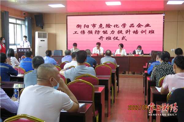 安全无小事,工伤重预防。9月26日上午,衡阳市2022年危险化学品企业工伤预防能力提升培训班在湖南天天安全教育培训中心正式开班。全市各企业单位重大危险源主要负责人、技术负责人和专职安全生产、工伤预防管理人员等共74人参加首批培训。市人社局相关负责人参加开班仪式并作培训动员。