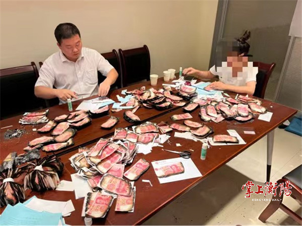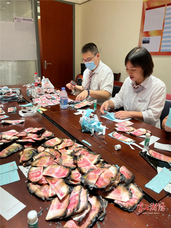 9月16日,一名老年客户在家人的陪同下携带大量被火烧毁的人民币百元券来到中行常宁支行营业部,焦急询问能否兑换成完整百元券。看到30来捆“黑石头”中有几叠可以看出是成捆的百元纸钞,内控行长和柜员考虑到数额较大,烧毁情况较为严重,为照顾老人情绪及客户隐私,立即邀请老人和陪同人员一家到会议室,向老人了解情况。
