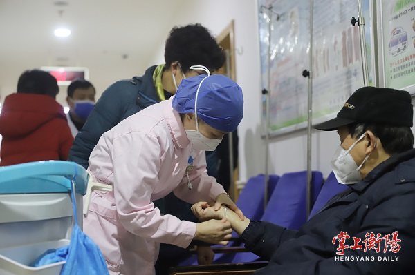 ▲急诊科护士顶着高热及身体不适为病人做皮试。