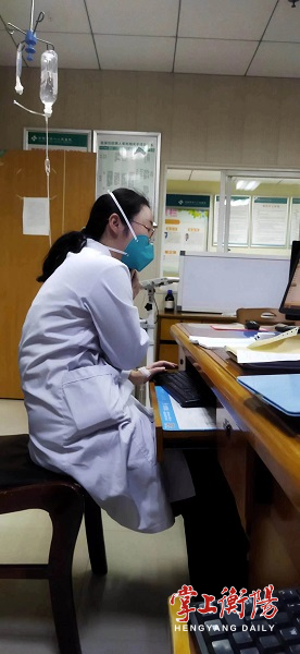 ▲肿瘤内科医生高热、全身乏力,一边输液一边处理医嘱。