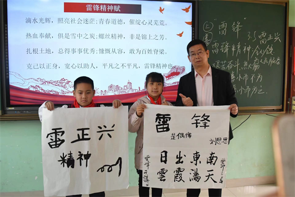 ▲张云峰书记和小朋友们共同书写雷锋精神。