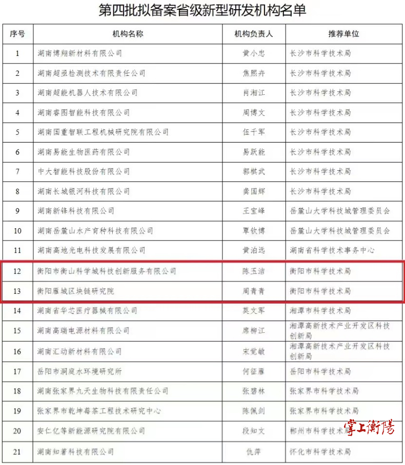 记者从市科技局获悉,省科技厅日前公示了第四批湖南省新型研发机构备案及培育名单,全省共有21家新型研发机构入选,我市衡山科学城科技创新服务有限公司、衡阳雁城区块链研究院上榜。