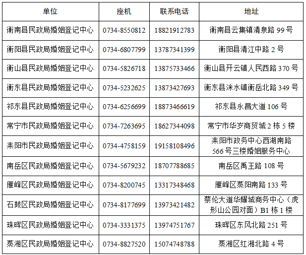 衡阳市各县市区民政局婚姻登记中心通讯录