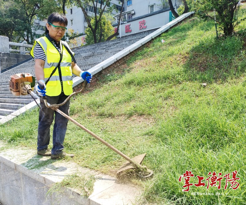 ▲邓太莲操纵割灌机整理草坪。