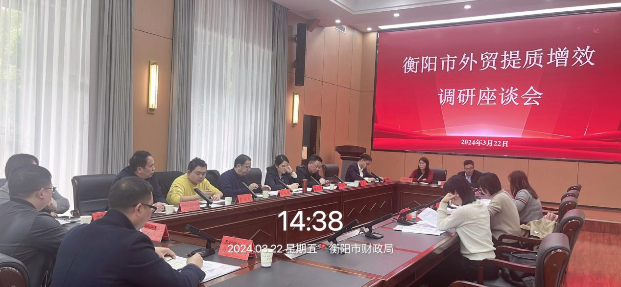 为提升经贸资金使用效能,加强“稳外贸”政策的针对性和有效性,充分发挥财政政策作用,助推全省进出口提质增效,3月22日,省财政厅外经处一级调研员李清菊带领省商务厅外贸处干部组成联合调研组,来衡阳开展专题调研并召开座谈会,了解衡阳外贸发展整体情况、外贸资金和政策情况、外贸提质增效申报及项目库建设情况,听取了相关职能部门及企业的相关需求和建议。