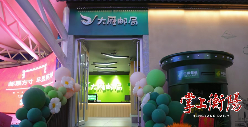 作为衡阳市邮政服务的新地标,大雁邮局以“绿色+复古+潮流网红风”为主题,将该店打造成为衡阳邮政文化的一站式“体验馆”“网红点”。大雁邮局外墙上浓郁高雅的墨绿色墙体搭配清晰明亮的“在雁城,心里邮你,信里也邮你”潮流标语,还有停放在旁的二八自行车,以及带着童年记忆的老邮筒,仿佛带大家穿越到了旧时光。