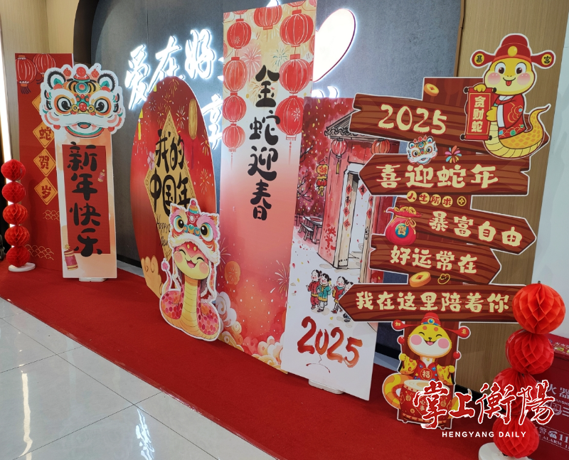 12月22日下午,在蒸阳南路一家大型超市,记者看见各式各样的灯笼、贺年喜庆挂件将商场装扮得喜气洋洋,超市的入口处新辟了宣传展区,展位上摆着“蛇元素”的各种宣传挂件、装饰品,以卡通化、时尚元素为主,蛇形吉祥物戴着各种各样的帽子,身着传统服饰,圆圆的笑脸、大大的眼睛,惹人喜爱,“金蛇迎春”四个大字抢眼夺目,吸引了不少年轻人驻足观赏,打卡拍照,将迎接新年的氛围感瞬间拉满,前来选购商品的市民络绎不绝。