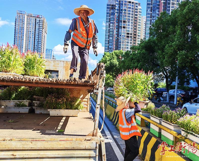 ▲绿化养护人员正在换花。