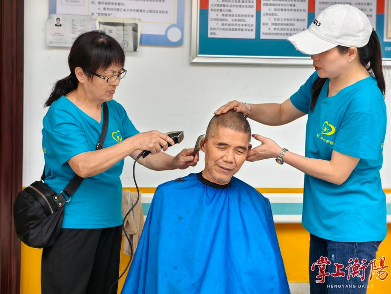 ▲志愿者为老人理发。