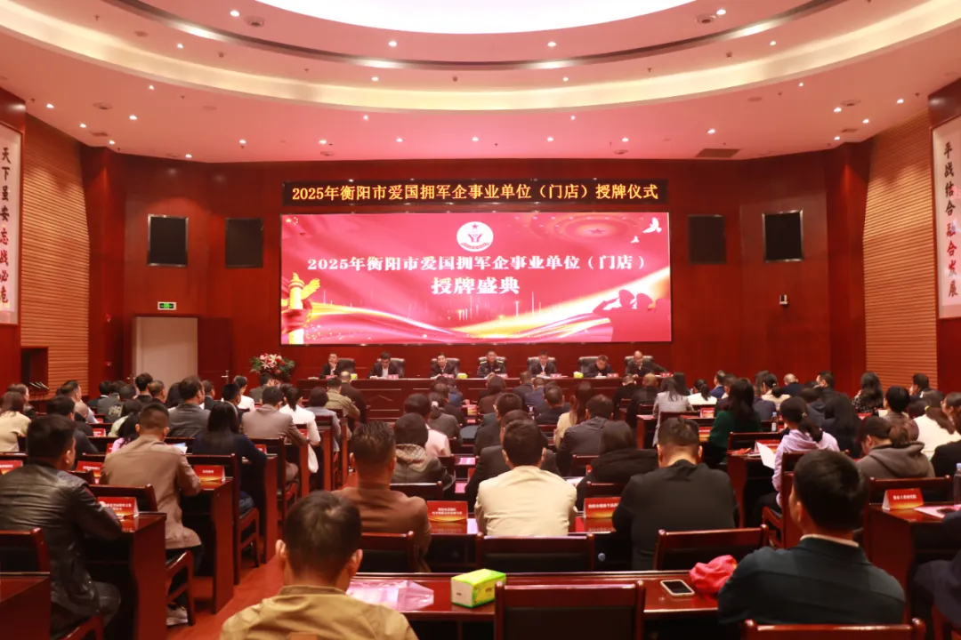 10月29日,衡阳市退役军人事务局联合市爱国拥军促进会,举行2025年衡阳市爱国拥军企事业单位(门店)授牌仪式,热烈欢迎96家爱国拥军企事业单位(门店)加入衡阳市爱国拥军队伍。军人军属、退役军人和其他优抚对象将在衡阳享受到更多便捷、优质、实惠的服务。
