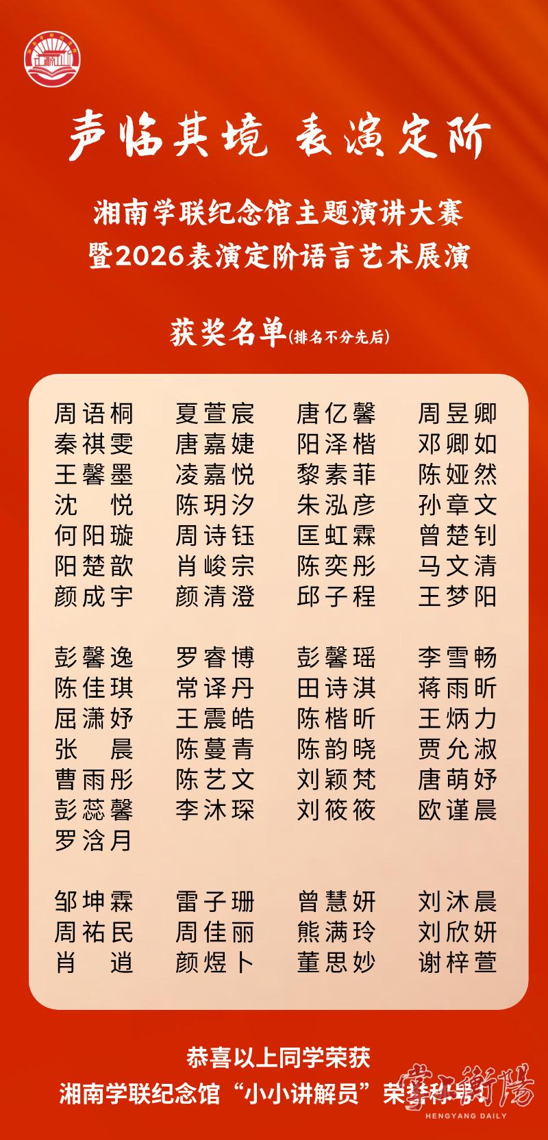 近日,由中国关心下一代工作委员会教育中心、全国青少年美育教育成果展演活动办公室联合指导,湘南学联纪念馆主办的“声临其境——分享身边好故事”主题演讲大赛暨2026表演定阶艺术展演活动圆满落幕。本次活动以“美育浸润+红色传承”为核心,搭建起青少年语言艺术展示与红色文化传播的优质平台,吸引了全市众多青少年及亲子家庭、集体团队踊跃参与,现场氛围热烈非凡。