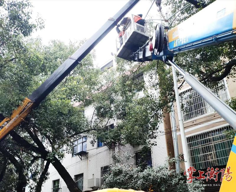 ▲工作人员站在高空作业车的作业斗内更换灯杆支架及灯具。
