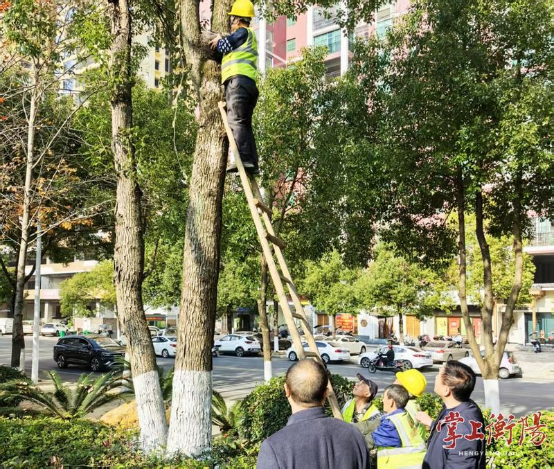 当日下午,整治行动工作专班分成两个小组,分赴蒸水北堤与湘江西岸,对树木安装景观灯、架设线缆等情况开展巡查。在蒸水北堤蒸水1号地段,工作人员轻轻架起梯子,小心翼翼地攀上香樟树茂密的枝丫间,仔细观察形如鸟窝的景观装饰灯。“每盏景观灯的位置、树枝有无破损,都要仔细看、认真记。”一名专班人员一边查看树干交接处,一边对同伴说道。另一组工作人员则在湘江西岸千吨级码头广场的银杏树下,工作人员站在木梯上仰头查看、记录着悬挂在枝条间的景观灯饰。