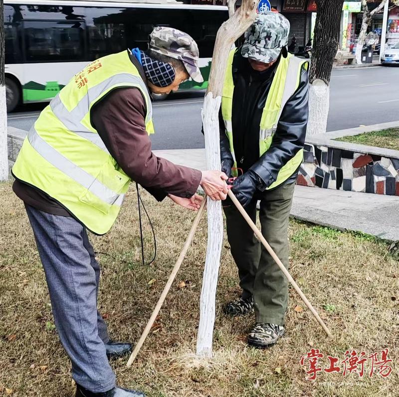 ▲园林工人正加紧对苗木进行加固处理,防范被大风刮倒。