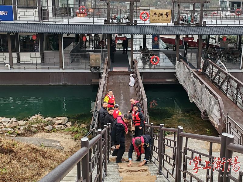 ▲执法人员督促经营单位对登船区域铺设防滑设施。
