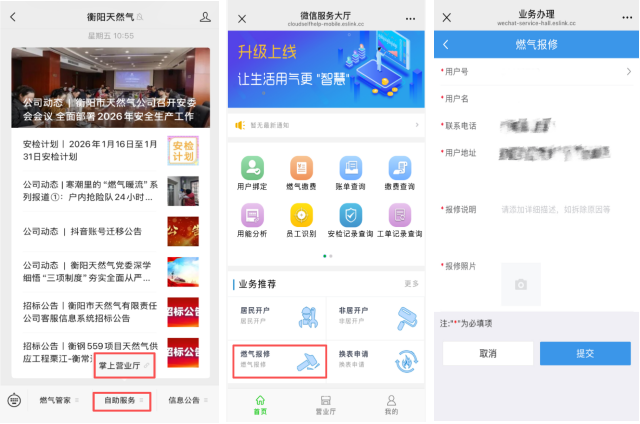 一键快速报修:如家中燃气设施出现异常,可通过公众号菜单栏进入【掌上营业厅】,选择【燃气报修】功能。请尽量详细描述问题,并留下准确地址与联系方式,维修人员将及时响应,提供上门服务。