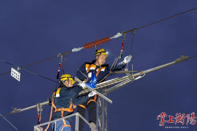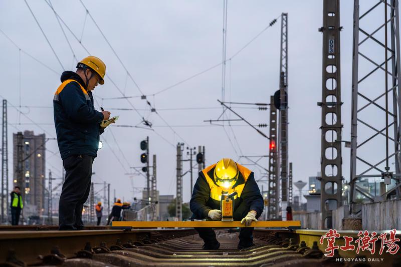 作为京广、衡柳、吉衡铁路的交会枢纽,衡阳站春运首日开行列车达166趟,40天预计到发旅客130万人次。当日17时12分,作业组抵达指定位置待命。18时10分,线路封锁后,工具材料迅速运抵现场。然而,因列车开行密度大,原定40分钟的“天窗期”被压缩至不足20分钟。地线组、防护组、梯车组、人工组分工协作,头灯与手电的光束在暮色中织就一张守护安全的光网。