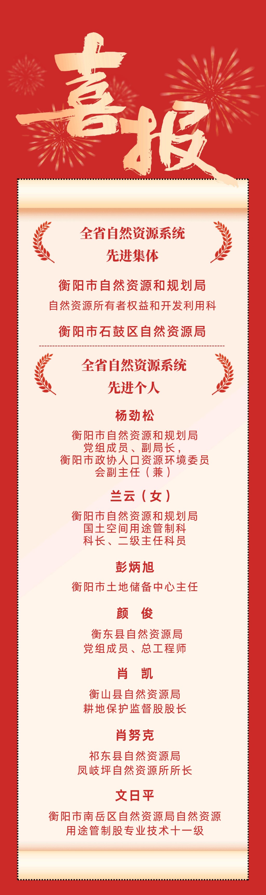 衡阳市2个集体、7名个人荣获全省自然资源系统先进集体和先进个人称号。这份荣誉,是他们担当实干、奋勇拼搏的成果,也是我市自然资源和规划系统全体干部职工践行使命、创先争优的缩影。希望全系统以先进为榜样,乘势而上、砥砺前行,为推进“制造立市、文旅兴城”发展战略贡献更大力量!