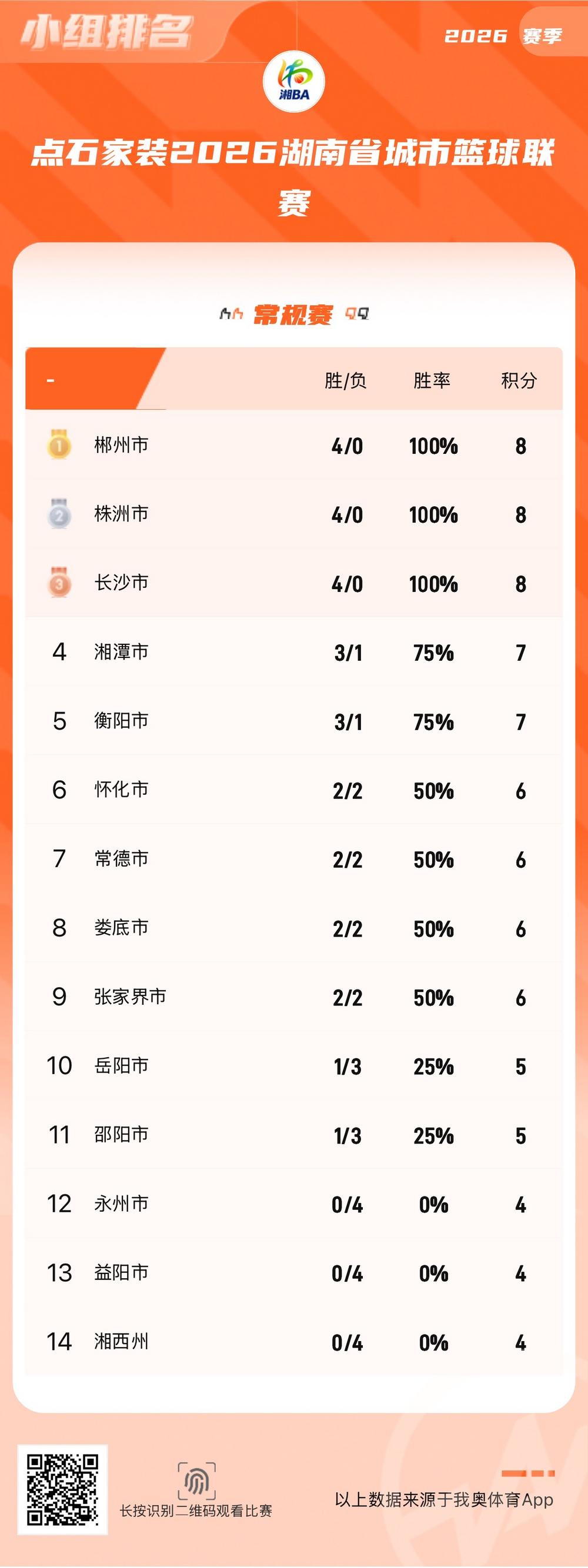 积分榜方面,郴州、株洲、长沙三队以4胜0负的全胜战绩位居前三。湘潭队与衡阳队同为3胜1负,积分相同。凭借净胜分优势,湘潭队位列第四,衡阳队位列第五。