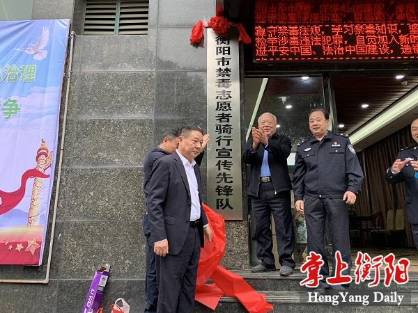 “出发!”10月8日,随着衡阳市禁毒志愿者骑行宣传先锋队揭牌仪式现场一声号令,50名队列整齐的禁毒志愿者,依次出发,沿长丰大道、解放大道一路骑行,向市民宣传毒品危害。