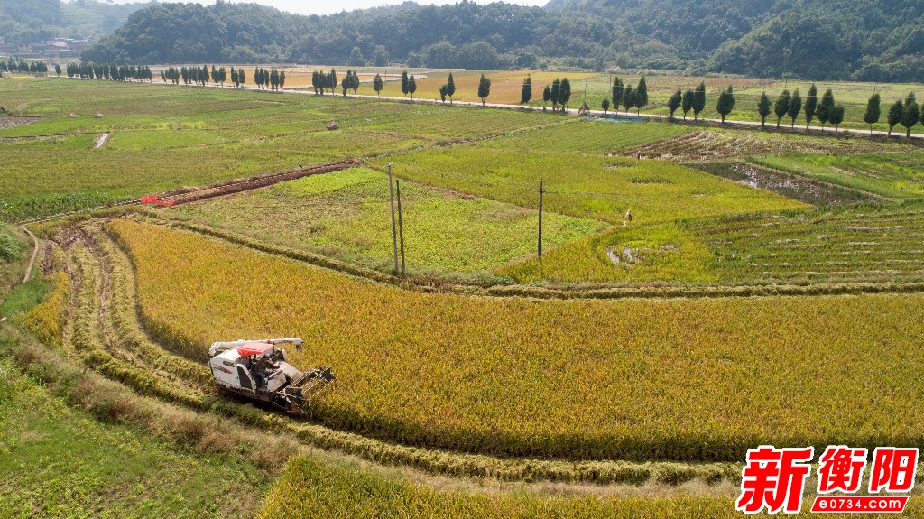 ▲深宫厦村的一片稻田里,一台收割机正在忙着秋收