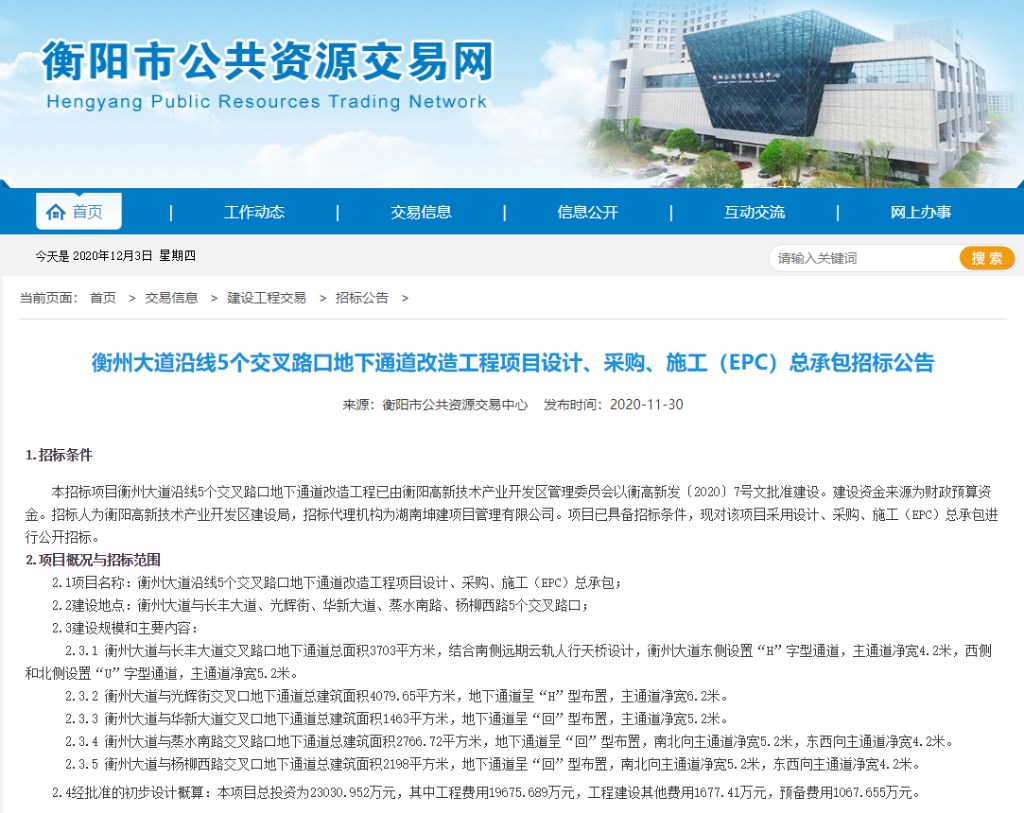 去年8月,《衡阳晚报》微信以《设计方案敲定!衡州大道将建5个地下通道,有电梯、智能系统……》报道了高新区将在衡州大道与长丰大道、光辉街、华新大道、蒸水南路和杨柳西路5个交叉路口设计地下通道的消息。今日,记者了解到,5个交叉路口地下通道的项目已于11月30日发布招标公告,这也标志着该工程进入招投标阶段,动工建设即将进入倒计时。