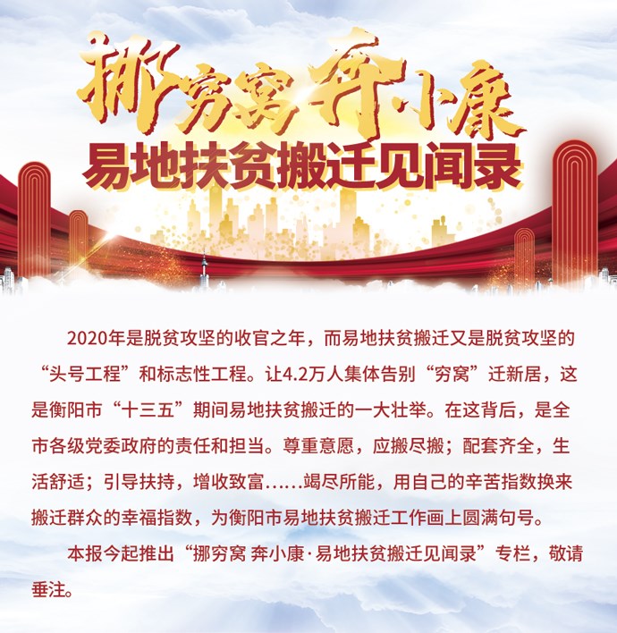 衡阳市人民政府于2016年3月就印发了《衡阳市“十三五”时期易地扶贫搬迁实施方案》,从搬迁对象确定到资金筹措渠道、从安置方式选择到安置区建设内容、从住房建设补助标准到后续资金管理、从用地规划调整到后续产业发展……既统筹住房建设、群众居住安全、增收致富、生活配套等多种因素,又把户型、建设标准、建设质量等细节都考虑在前。