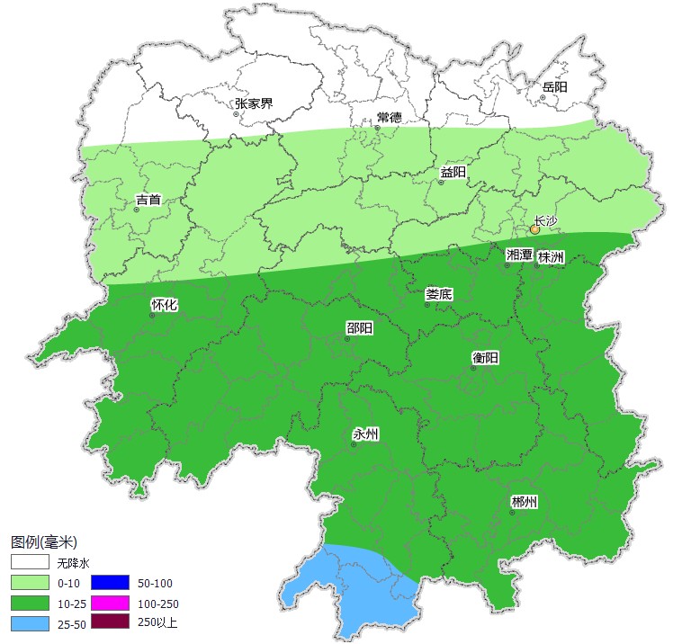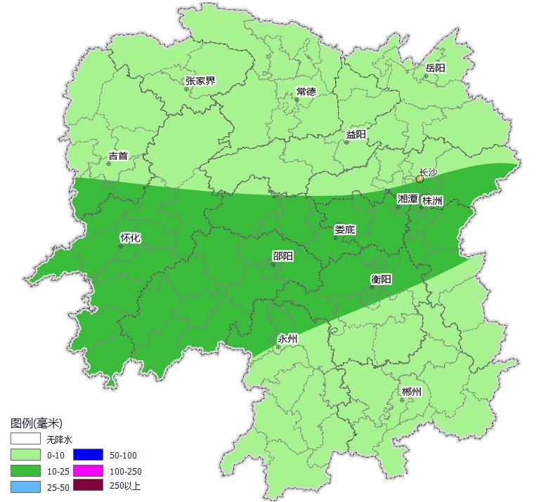 2月9日20时至2月10日20时,怀化、邵阳、娄底、长沙、湘潭、株洲、衡阳、永州、郴州阴天有中到大雨,其中永州南部、郴州南部、株洲南部局地暴雨,湘西州、张家界、常德、益阳、岳阳阴天有小到中等阵雨或雷阵雨;北风2~3级;最高气温10~12℃;最低气温湘西、湘中5~7℃,其他地区8~10℃。