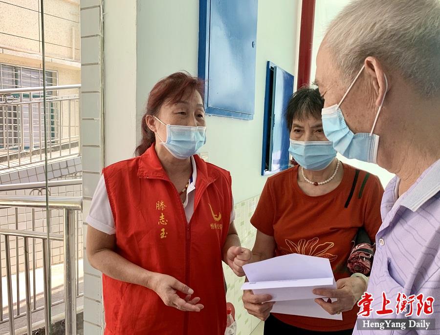 “请把身份证拿出来,先量下血压,慢点,没关系的……”7月9日,记者见到滕志玉时,她正穿着红马甲,顶着37℃的高温,在珠晖区苗圃街道卫生服务中心引导前来接种新冠疫苗的居民有序排队,并讲解注意事项。