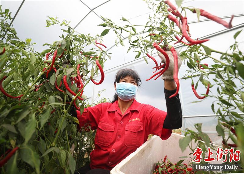 ▲8月5日上午,衡阳县洪市镇大印村村民在采摘准备捐赠的辣椒。曹正平 摄