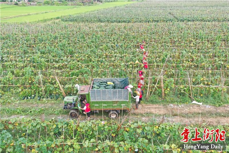 ▲8月5日上午,志愿者在衡阳县关市镇与当地村民一起采摘准备捐赠的冬瓜。刘欣荣 摄