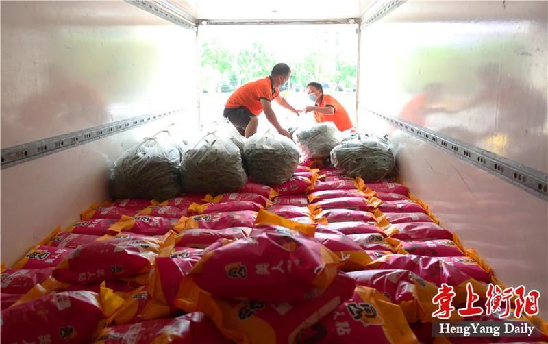 ▲8月6日上午,在湖南角山米业有限责任公司,工作人员正在把捐赠的生活物资装车。曹正平 摄