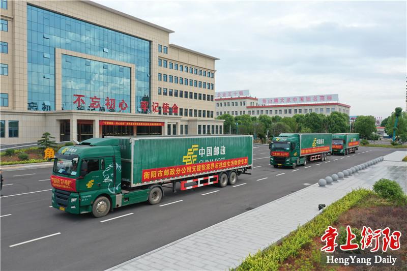 ▲8月6日上午,3辆满载着抗疫生活物资的邮政运输车从衡阳县出发前张家界市。曹正平 摄