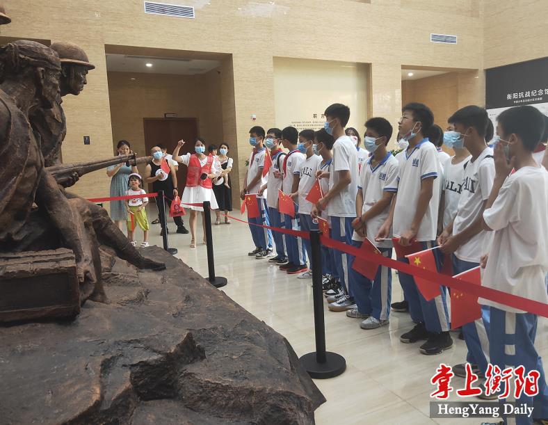 2日下午,在衡阳抗战纪念城陈列室序厅内,记者看见来自雅礼中学的30位学生,在志愿者的帮助下,完成了“三码联查”及身份信息登记后,有序入馆参观,学生们挥舞着手中的国旗,在大型浮雕前合影留念。