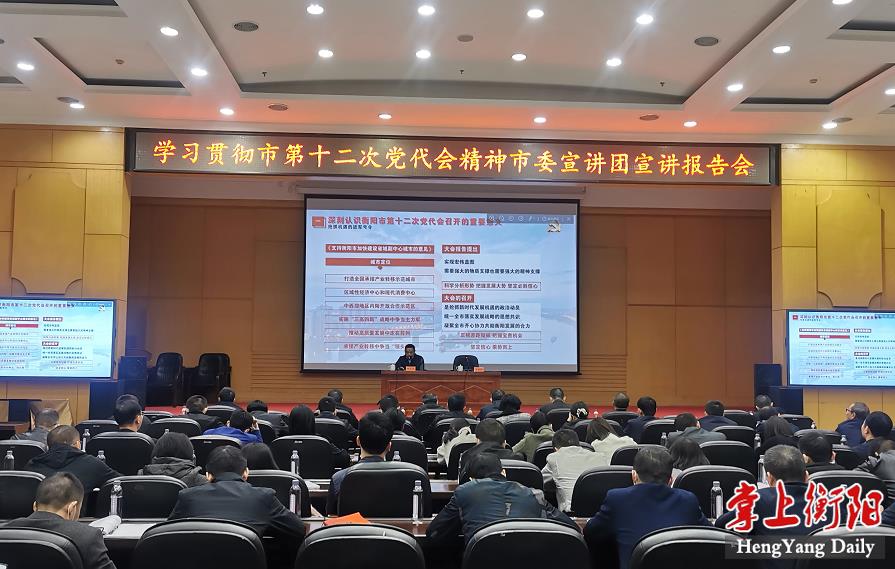 市委宣讲团成员、市政府研究室主任张少华作宣讲报告。他围绕市第十二次党代会的重要意义、主要内容,以及如何把握市第十二次党代会精神的落实举措等方面,进行了全面、权威、深刻、生动的宣讲。他说,全面传达贯彻落实市党代会精神,是衡阳当前和今后一个时期首要的政治任务,全市各级党组织和广大党员干部要统一思想和行动,切实把智慧和力量凝聚到落实“三高四新”战略、推进“三强一化”建设的目标任务上来,以更加务实的举措、更加振奋的精神,为衡阳在全省率先基本实现社会主义现代化而努力奋斗。