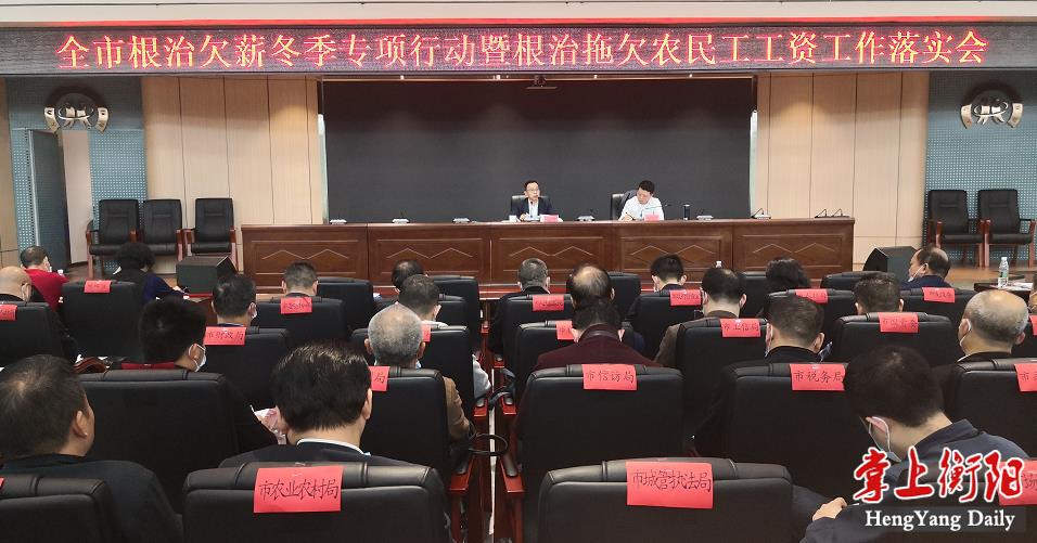 掌上衡阳客户端11月5日讯(记者李建平) 今日下午,继全国根治欠薪冬季专项行动动员部署电视电话会议后,全市根治欠薪冬季专项行动暨根治拖欠农民工工资工作落实会随即召开。会议要求,坚决扛牢政治责任、解决突出问题、落实工作责任,按时足额保障好农民工“养命钱”。市委常委、常务副市长毛朝晖出席会议并讲话。